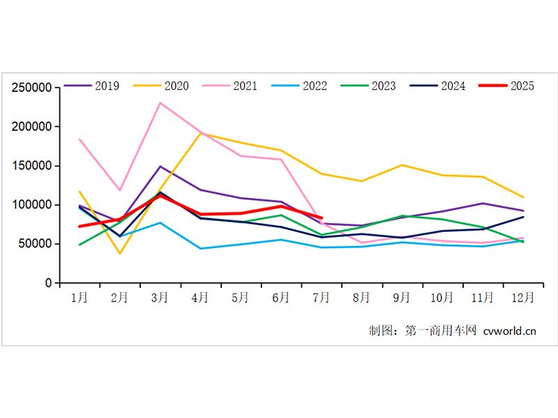 從今年4月至7月,我國重卡市場“四連漲”,并且增幅呈現出加速度,7月份銷量同比增速已經超過40%。在這個承上啟下的三季度第一個月里,各家主流重卡企業的表現究竟如何?請看第一商用車網帶來的分析報道。7月重卡銷8.3萬輛!電卡大漲,氣卡迎來“曙光”根據第一商用車網最新掌握的數據,2025年7月份,我國重卡市場共計銷售約8.3萬輛(批發口徑,包含出口和新能源),環比6月下降15%,比上年同期的5.83萬輛上漲約42%。這也是重卡市場自今年4月份以來的四連漲,且漲幅逐月擴大——4月、5月銷量同比增長6.5%和13.6%,6月份同比增長37%,7月份同比增超4成,跑出了市場加速度。8.3萬輛放在最近八年來看,屬于第二高水平,只低于2020年7月的13.9萬輛,比其他年份的同月銷量都要高。累計來看,今年1-7月我國重卡市場銷量約為62.2萬輛,同比增長約11%。2019-2025年我國重卡市場銷量月度走勢圖(單位:輛)7月份,不僅重卡批發銷量實現了42%的同比增長,國內終端重卡銷量也實現了同比上漲,雖未達到6萬輛以上規模,但同比漲幅超過20%,環比降幅預計在19%左右。需要提及的是,7月份重卡市場批發和零售銷量環比均有所下降的原因,是部分主流車企半年末沖量以及電動重卡上半年末突擊上牌,因此對后面月份的重卡銷量造成了一定透支,再加上市場需求逐漸進入“淡季”,因此,7月份重卡銷量環比下降是必然。7月份批發銷量和零售銷量繼續呈現同比上漲,首要原因仍然是國四貨車以舊換新政策。截止到5月底,幾乎所有省市自治區的貨車以舊換新細則都已完成落地,因此,5月中下旬、6月和7月,政策對重卡新車購置需求的促進作用穩定顯現出來。另外,今年7月份的重卡出口批發銷量預計同比增長超過20%,該細分領域的表現同樣超出預期。7月份,行業批發銷量和終端銷量再度雙雙同比增長,幾個重點細分市場的表現如何?先看燃氣車。7月份,燃氣車國內終端銷量環比有所回升,盡管同比呈現20%以上的降幅(這已經是連續第五個月同比較大下滑),但環比基本持平,國內滲透率預計也從6月份的20%以下復蘇到7月份的24%左右。其中原因,主要是油氣價差有所擴大,再加上北方以舊換新政策的落地和執行(北方地區是燃氣重卡的主銷區域),推動了燃氣重卡需求一定程度上的改善。預計該細分領域有望在今年8月實現“轉正”。再看電動車。今年年初至今,新能源重卡在中短途貨運市場上持續熱銷,加上貨車以舊換新帶來的舊車置換電卡需求,第一商用車網預計7月國內新能源重卡終端銷量超過1.5萬輛,同比增長超1.2倍(環比有兩位數下降),單月滲透率預計超26%。這已經是新能源重卡銷量連續五個月超過1.5萬輛、月度滲透率連續四個月超過23%、連續兩個月超過26%。此外,國內柴油重卡7月份終端銷量預計同比增長超過25%,但環比降幅也超過了25%。重汽2.2萬登頂!解放/東風破1.4萬,福田/徐工翻倍2025年7月,我國重卡行業銷量實現“四連漲”,幾家主流企業交出了什么“成績單”?第一商用車網數據顯示,在7月份的排位賽中,中國重汽以2.2萬輛“登頂”,解放和東風雙雙超1.4萬輛;同比增速跑贏大盤的企業有福田(134%)、徐工(100%)、東風(84%)和江淮(59%)。累計來看,2025年1-7月市場份額實現同比增長的企業包括福田、徐工和陜汽。具體來看,中國重汽7月份銷售重卡約2.2萬輛,同比增長約37%,銷量保持行業第一;其1-7月累計銷售約17.1萬輛,同比增長約10%,市場占有率約為27.5%。一汽解放7月份銷售重卡約1.5萬輛,同比增長約42%;2025年1-7月,解放重卡累計銷量約11.35萬輛,市場占有率約18.2%,累計銷量保持行業第二。東風公司(包括東風商用車、東風柳汽乘龍、東風華神等)7月份銷售重卡約1.4萬輛,同比漲幅約為84%,月銷量保持行業前三;今年1-7月,東風公司累計銷售各類重卡10.12萬輛,同比增長約10%,市場占有率約為16.3%。陜汽集團(包括陜汽重卡、陜汽商用車等)7月份銷售重卡約1.25萬輛,同比增長約12%;2025年1-7月,陜汽集團銷售各類重卡約10.18萬輛,同比增長約11%,市場占有率約16.4%,同比上升約0.1個百分點。從同比漲幅來看的話,福田和徐工是增速最高的兩家企業。北汽福田7月份銷售重卡約1.15萬輛,同比增長約134%,這也是主流企業中最大的同比增速;2025年1-7月,北汽福田累計銷售各類重卡約7.8萬輛,同比上漲約81%,市場占有率約12.5%,同比上升約4.9個百分點。以新能源重卡為主力的徐工重卡7月份銷車約0.3萬輛,同比翻倍;其1-7月累計銷售約1.98萬輛,同比增長約77%,市場占有率約為3.2%,上升了約1.2個百分點。江淮汽車2025年7月銷售重卡約0.13萬輛,同比增長約59%;1-7月累計銷售約0.9萬輛,同比增長約9%,市場份額約為1.4%。結束語三季度的第一個月,重卡批發銷量和國內終端銷量繼續保持同比上漲,為下半年市場開了個好頭?;诟鞯刎涇囈耘f換新政策對新車市場的刺激作用,再加上去年下半年重卡銷量的連續多月走低(三季度月均批發銷量不到6萬輛,7-10月的月均批發銷量也只有6.1萬輛),預計今年三季度重卡銷量將會實現同比較大幅度增長,尤其是9月份的同比增速有望達到50%以上。